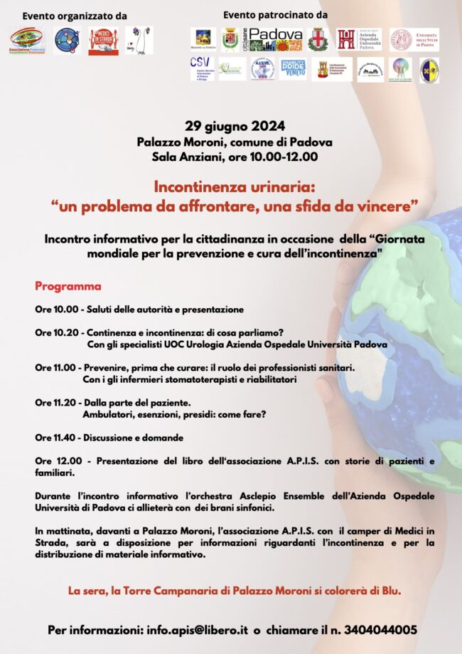 29 Giugno 2024 – Prevenzione e cura dell'incontinenza urinaria 29 giugno 2024 dalle 10 alle 12 Sede: Sala Anziani Palazzo Moroni – Comune di Padova Vedi il programma completo