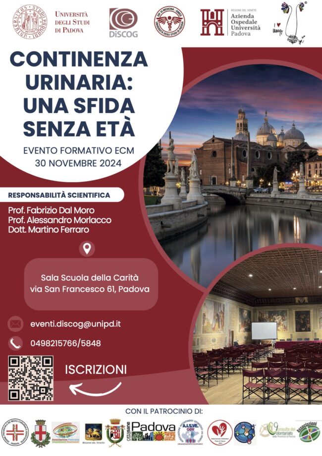 Prof. Fabio ZattoniContinenza urinaria: una sfida senza età 30 novembre 2024 ore 9.00-16.00 Scuola della Carità Via San Francesco, 61 – Padova Scarica il programma completoIscriviti